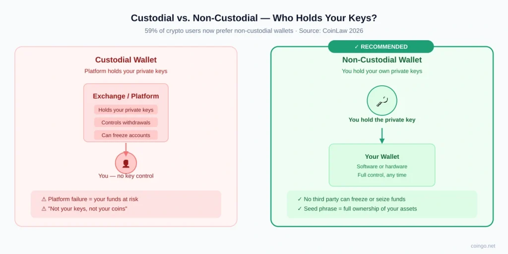 In a non-custodial wallet, you hold the keys directly. A seed phrase — typically 12 or 24 words — is generated when you create the wallet. This phrase is the master key to all your funds. Anyone with it can access your assets. Anyone without it — including you, if you lose it — cannot. As of 2025, 59% of crypto users now prefer non-custodial solutions, up significantly from prior years, reflecting growing awareness of self-custody principles.