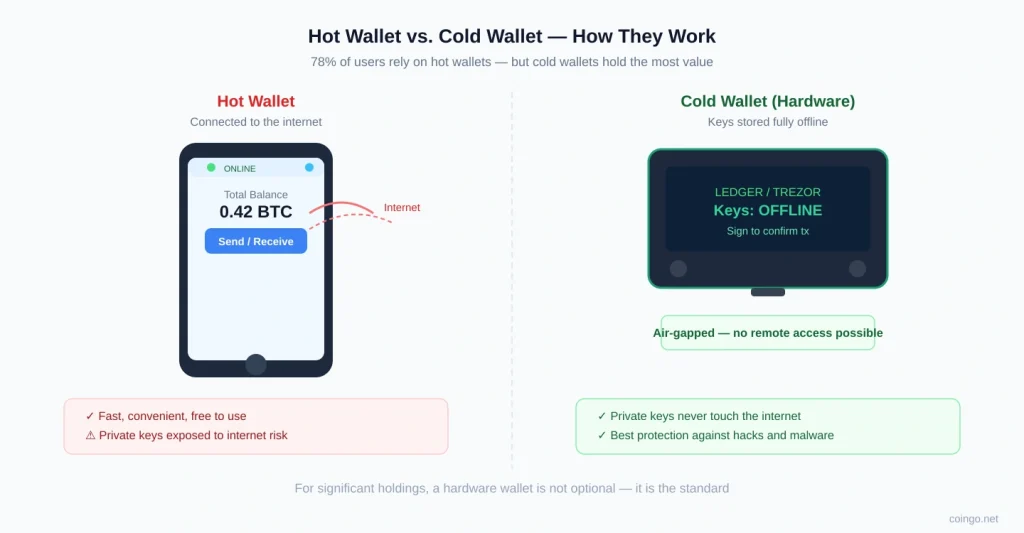 The most fundamental distinction in crypto storage is whether your wallet is connected to the internet. A hot wallet — any software wallet on a phone, computer, or browser extension — is always online. This makes it fast and convenient for transactions, but it also means the private key is potentially reachable by hackers, malware, and phishing attacks. Hot wallets account for 78% of all crypto wallets due to their accessibility.