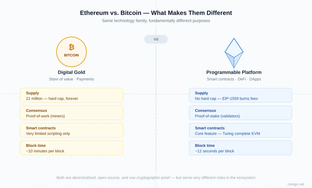The most common confusion for newcomers is the relationship between Bitcoin and Ethereum. Both are blockchains, both decentralized — but they were built for fundamentally different purposes.